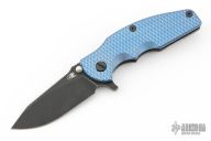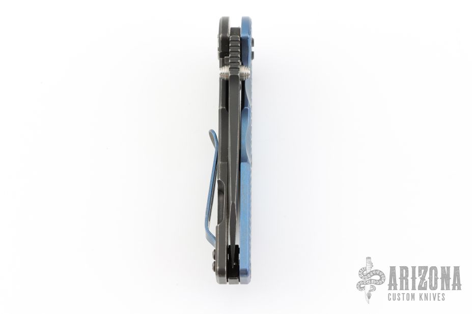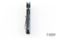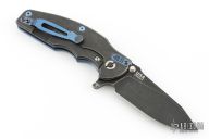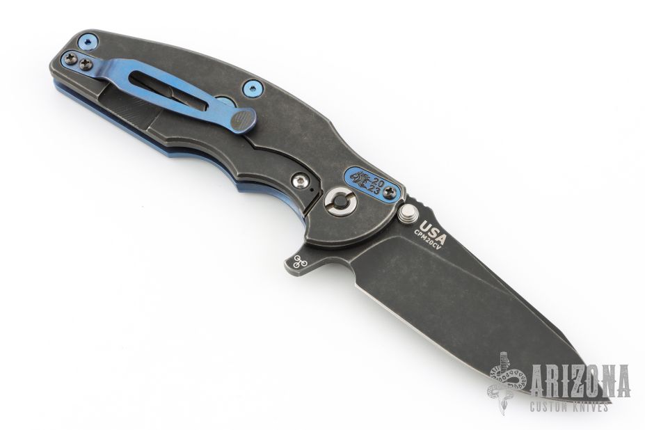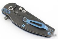 This Jurassic by Hinderer Knives features a blackwashed, drop point blade with notched thumbrest and flipper. The handle has an anodized/stonewashed titanium frame with, tip up or down reversible clip and a modular backspacer. Nice detent, lockup and blade seating. This knife has the Tri-Way pivot system. Comes with original box, card, and extra washers. Includes blackwashed LBS not attached. Has a couple light scuffs, excellent condition.