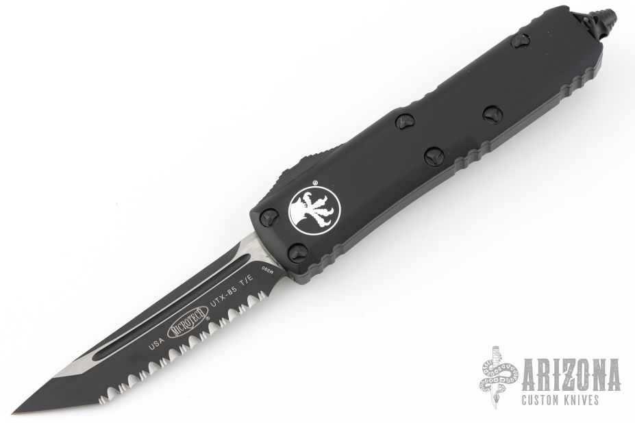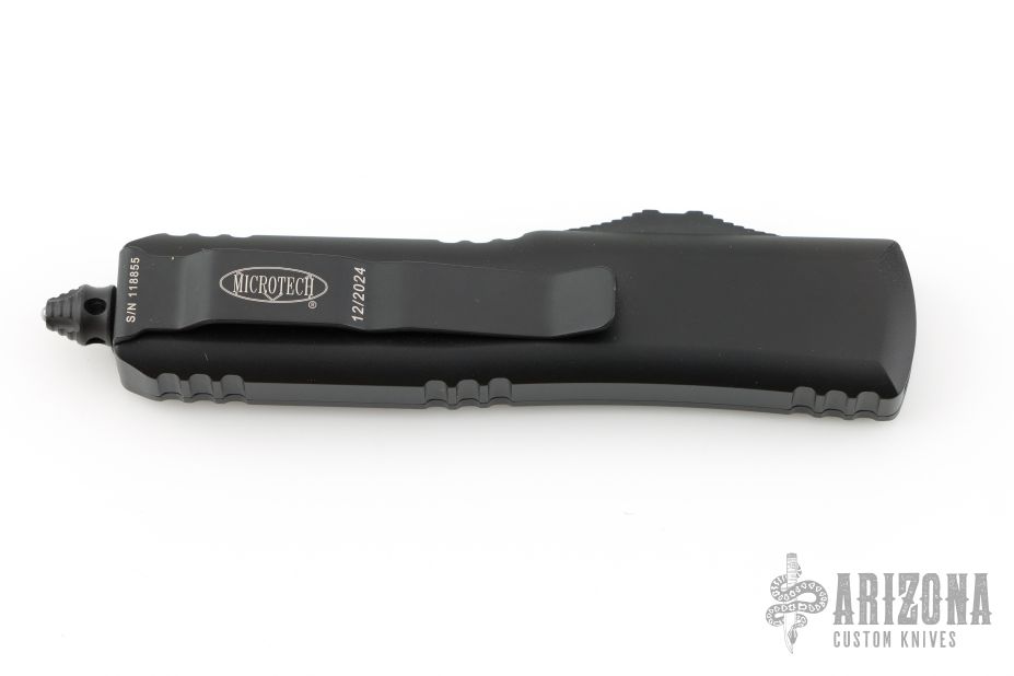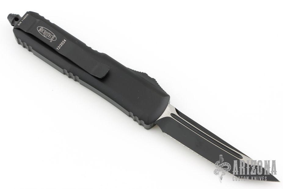 This UTX-85 by Microtech features a black fully serrated tanto blade. The handle has a black aluminum frame with black hardware and tip down clip. Comes with original box and papers. Dated 12/2024 and s/n 118855. Excellent condition.