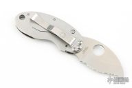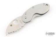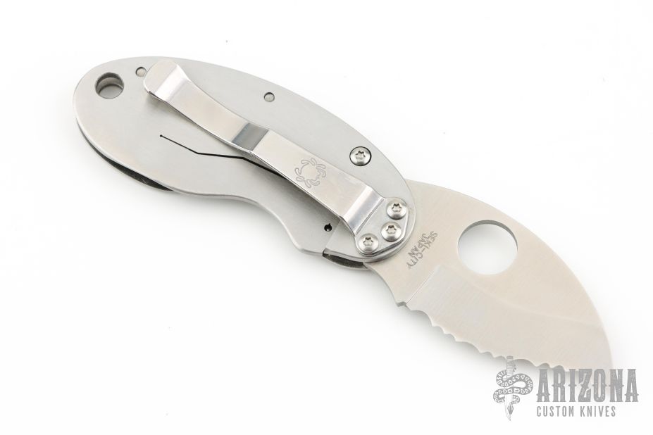 The Spyderco Cricket features a satin finished blade with serrations. Satin finished steel frame with a tip down pocekt clip. Includes the original box. Has some light scratches, otherwise Excellent Condition.