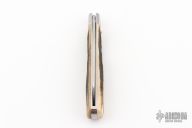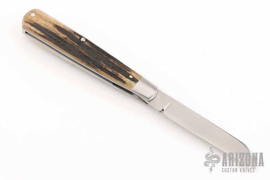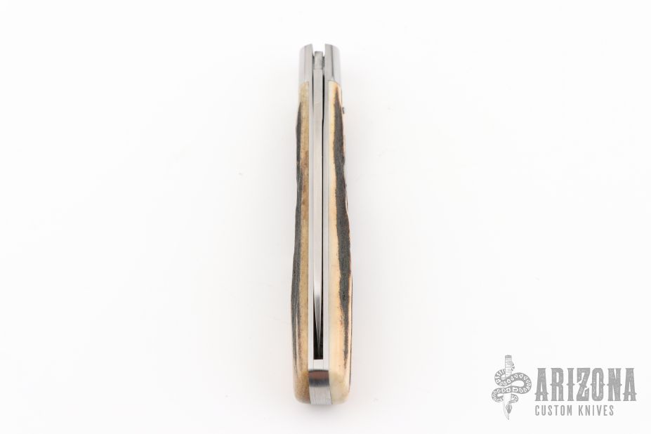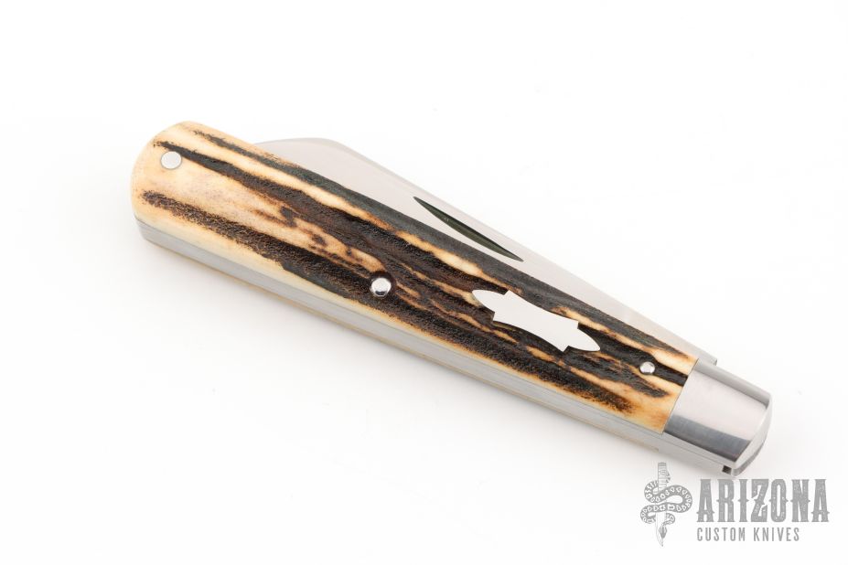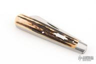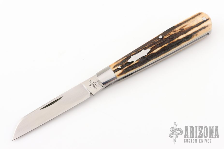This Slipjoint by TA Davison features a hand rub satin finished wharncliffe blade with nail nick. The handle has stainless steel bolsters, stag covers with stainless steel escutcheon, stainless steel liners, stainless steel spring. Comes with zippered case. Has half-stop, flush in all positions. #2648. New from maker!
