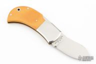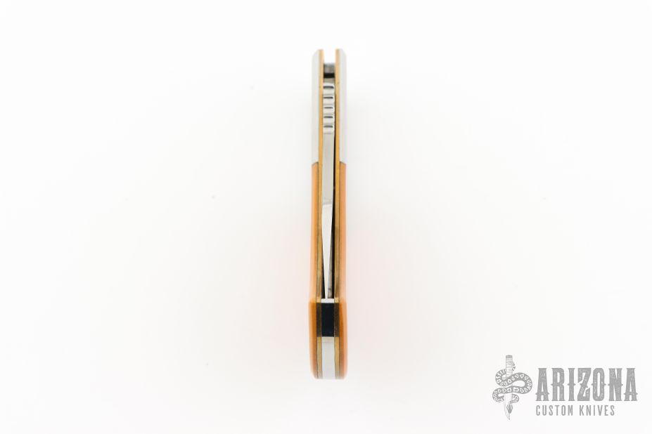 This Bull Dog II by Al Mar Knives features a mirror polished blade with nail nick. The handle has stainless steel bolsters, yellow paper micarta scales, brass liners and a stainless steel backspacer, lanyard hole at the butt. Has some scratches, otherwise great condition.