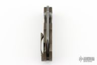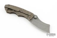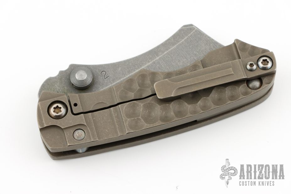 This "Bill The Butcher" folder by Kingdom Armory features a drop belly blade with notched thumbrest and dual thumbstuds. The handle has a tumbled and anodized titanium frame with matching backspacer and tip up clip. Nice detent, lockup and blade seating. Comes with a Huckleberry Woodchuck custom knife case with COA. Excellent condition. #2 on blade