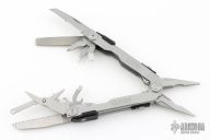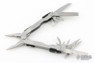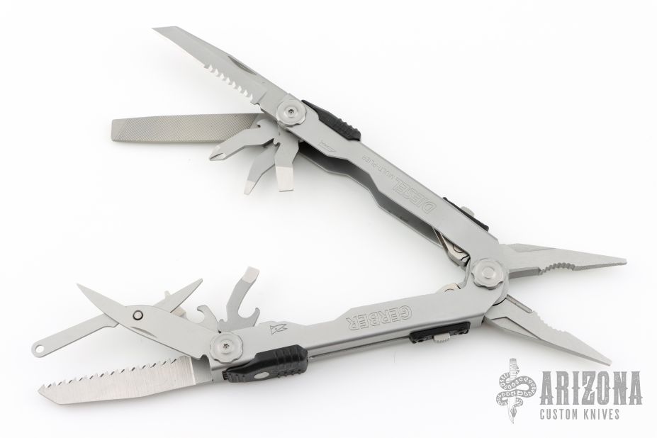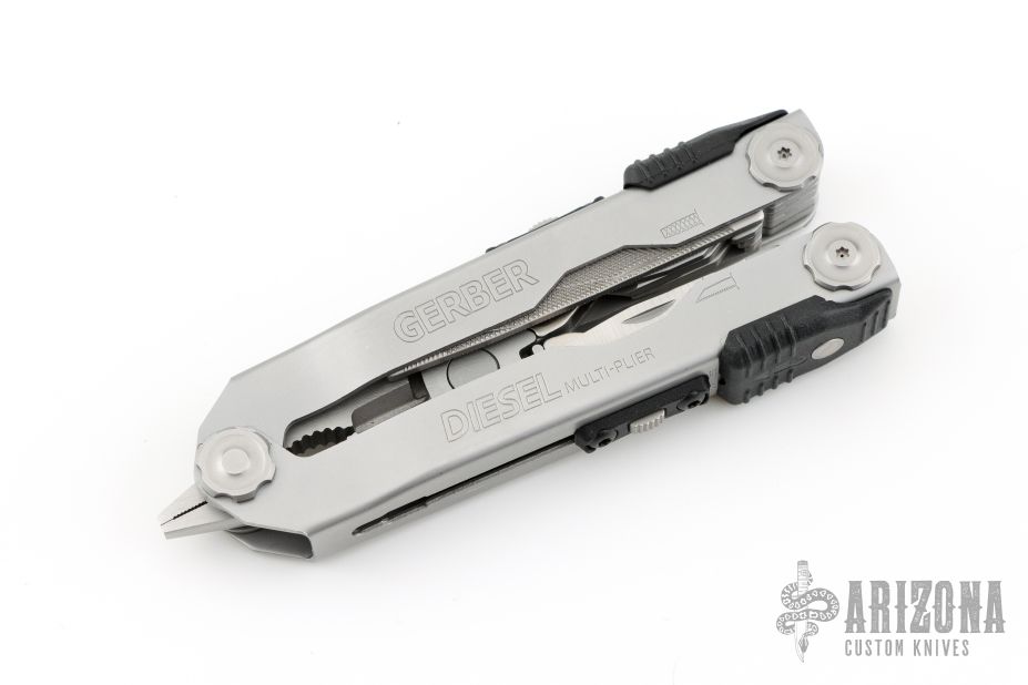 This Gerber Diesel Multi-Plier. Contains: Needlenose pliers, wire cutters, partially serrated knife, small/ med/ lg flat blade screwdrivers, can opener, bottle opener, scissors, file, lanyard loop, saw, and phillips head screwdriver. Comes with original box, papers, nylon sheath. Also has Kydex belt sheath. Has a couple light scuffs and scratches, otherwise Excellent condition.