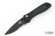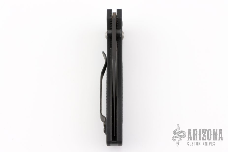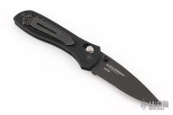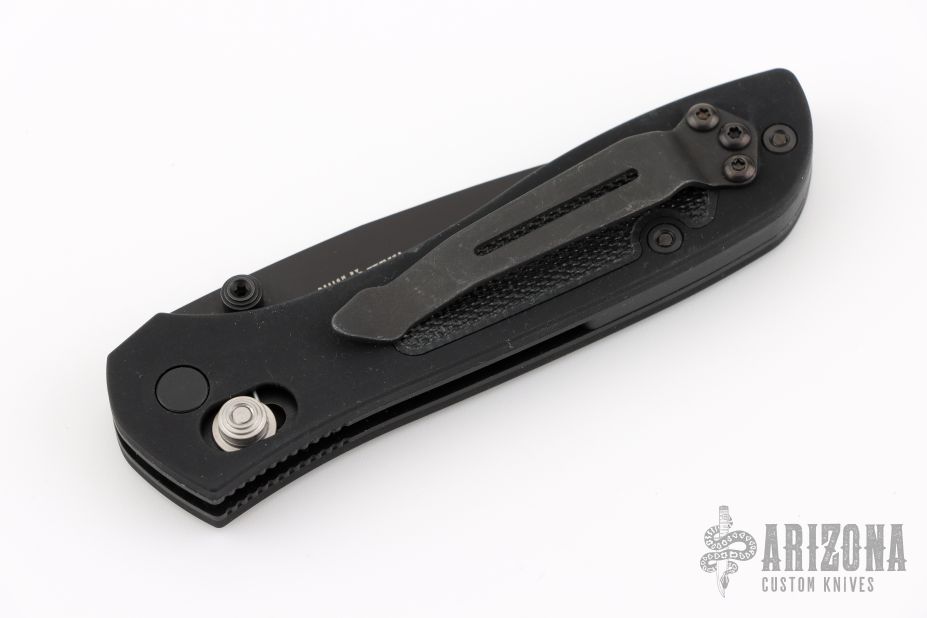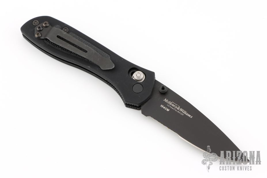 This 707 from Benchmade features a black spear point blade with dual thumbstuds and a false top edge with serrations. The handle has anodized aluminum scales and black G-10 inserts, stainless steel liners, and a black backspacer. Tip up reversible stainless steel clip. Comes with original box, pouch, and papers. Has a couple light scuffs, excellent condition otherwise.