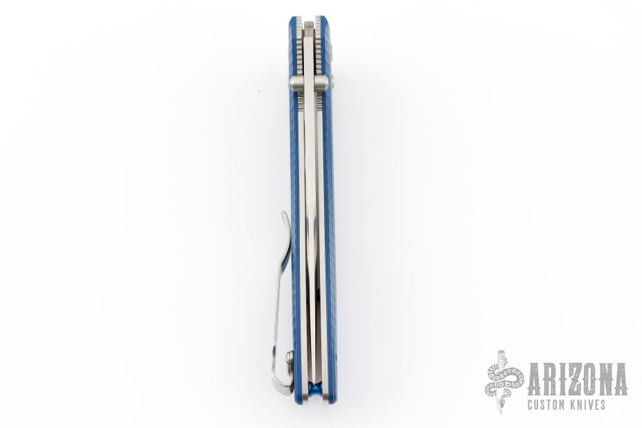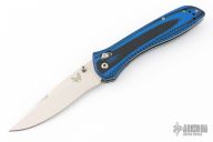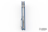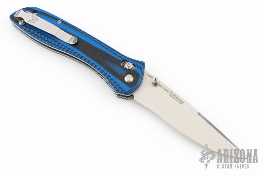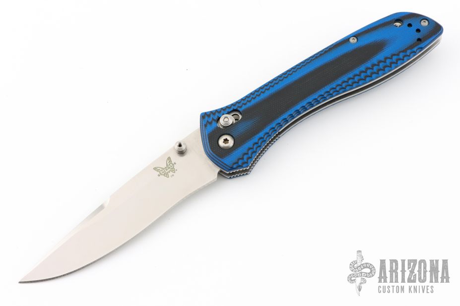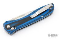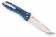 This Benchmade 710-1401 features a stonewash finished drop point blade with "710-1401 Limited" on the blade. The handle is blue/black milled G10 with the axis locking mechanism and reversible deep carry clip positioned for tip up carry. Nice action, detent and blade seating. Comes with original box, pouch, and papers. Excellent condition.