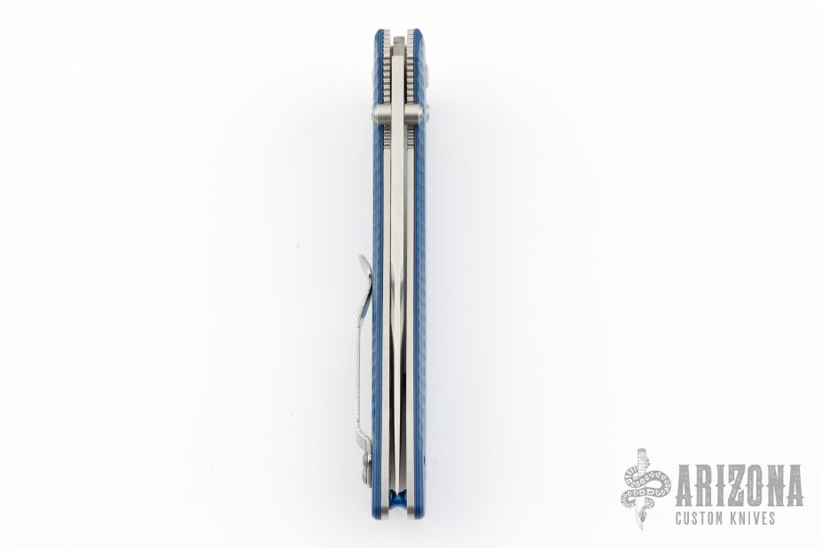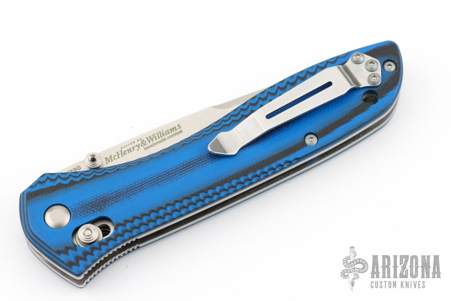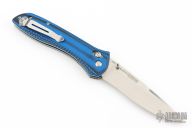 This Benchmade 710-1401 features a stonewash finished drop point blade with "710-1401 Limited" on the blade. The handle is blue/black milled G10 with the axis locking mechanism and reversible deep carry clip positioned for tip up carry. Nice action, detent and blade seating. Comes with original box, pouch, and papers. Excellent condition.
