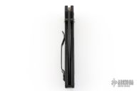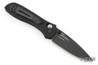 This 707 from Benchmade features a black spear point blade with dual thumbstuds and a false top edge. The handle has anodized aluminum scales and black G-10 inserts, stainless steel liners, and a black backspacer. Tip up reversible stainless steel clip. Comes with original box, papers, and pouch. Has some light scratches on the clip. Excellent condition.