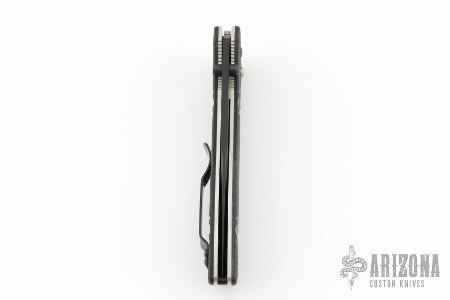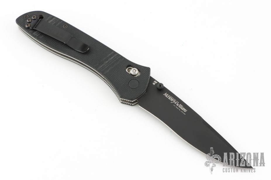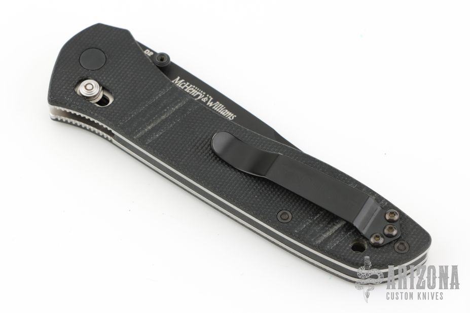 This Benchmade 710 McHenry has an D2 black drop point blade with dual thumb studs. Handle is black G10 with milled ribs, and black stainless steel tip up clip. Comes with original box and papers. Has a couple light scratches, Excellent condition.