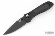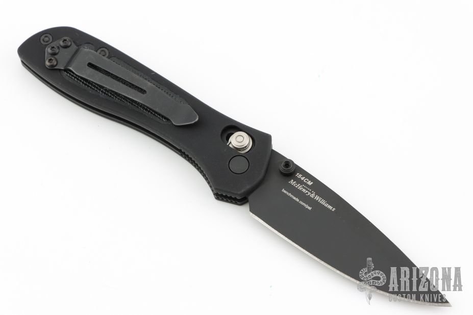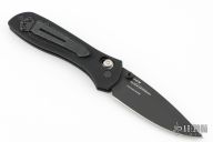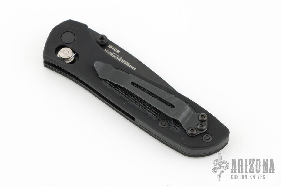 This 707 from Benchmade features a black spear point blade with dual thumbstuds and a false top edge. The handle has anodized aluminum scales and black G-10 inserts, stainless steel liners, and a black backspacer. Tip up reversible stainless steel clip. Comes with original box, papers, and pouch. Has some light scratches on the clip. Excellent condition.