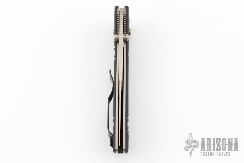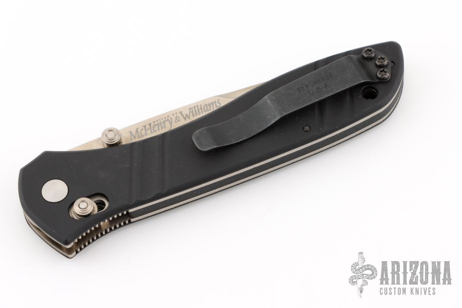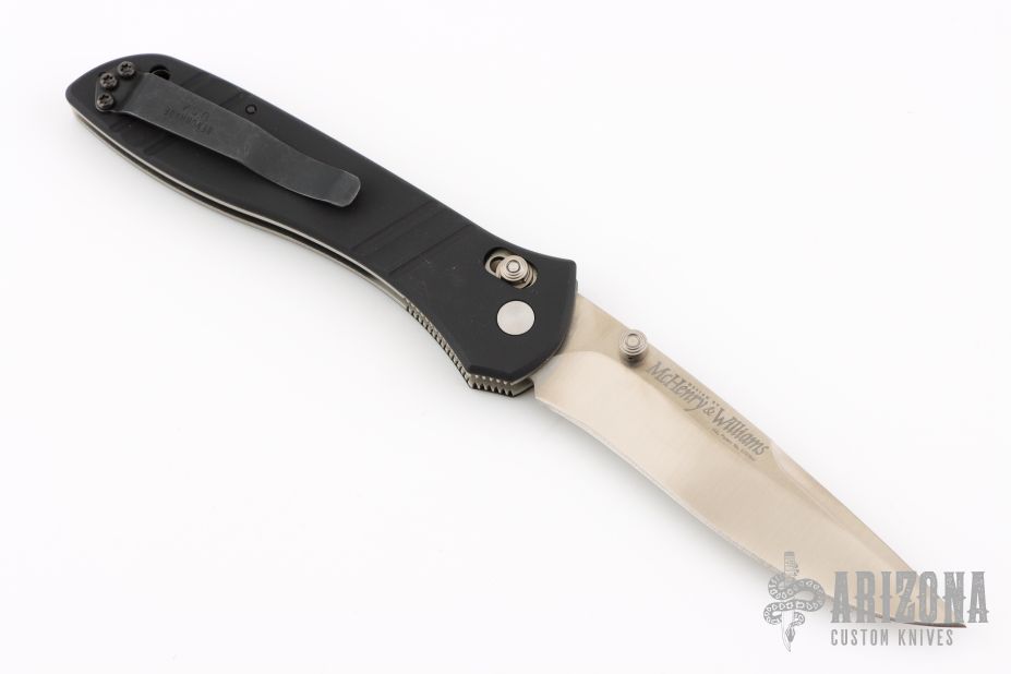 This Benchmade 710 McHenry & Williams Prototype has a satin finished blade with dual thumb studs. Handle is black aluminum scales with milled ribs, stainless steel liners, and black stainless steel tip up clip. Comes with original box. Has some light scuffs on the body and some scratches on the clip. Excellent condition.