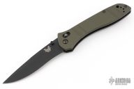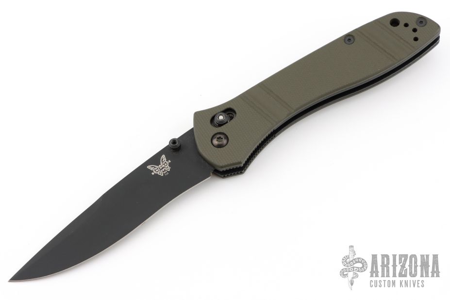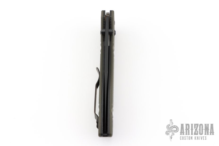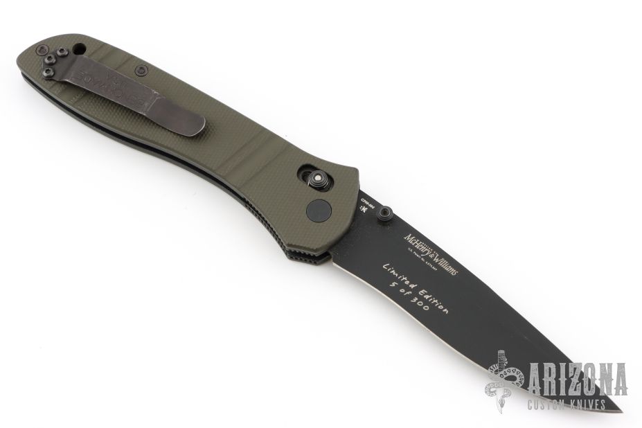 This Benchmade 710-801 features a black finished drop point blade with "5 of 300" on the blade. The handle is OD Green milled G10 with the axis locking mechanism and reversible deep carry clip positioned for tip up carry. Nice action, detent and blade seating. Comes with original box and papers. Has some light scratches on the clip, Excellent condition.