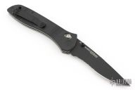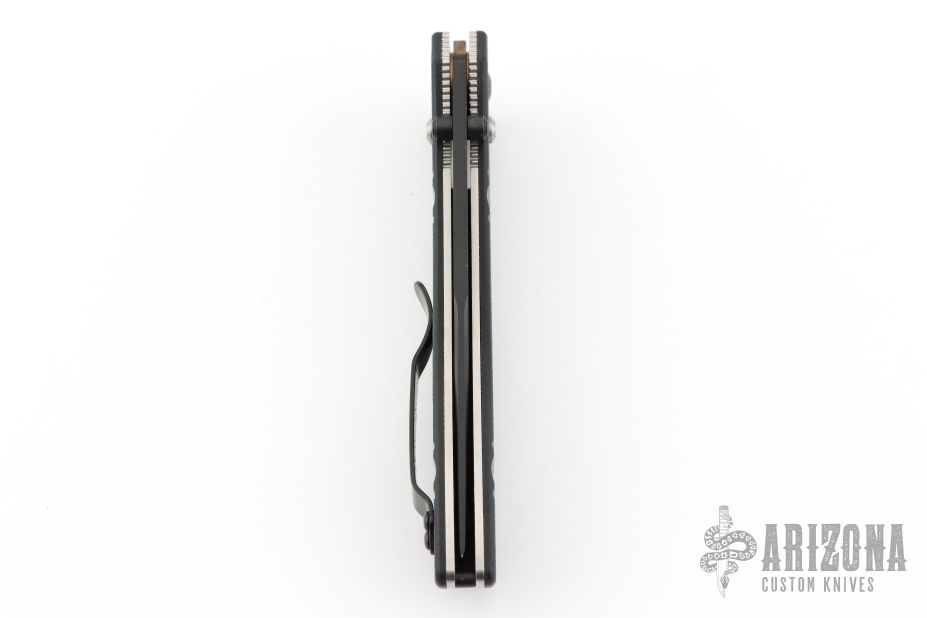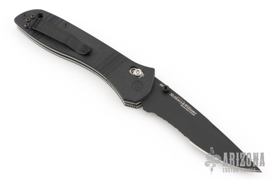 McHenry & Williams design. Axis lock mechanism. Black partially serrated blade with dual thumbstuds. The handle has fluted black G-10 scales, stainless liners and black tip up clip. Comes with original box and papers. Excellent condition.