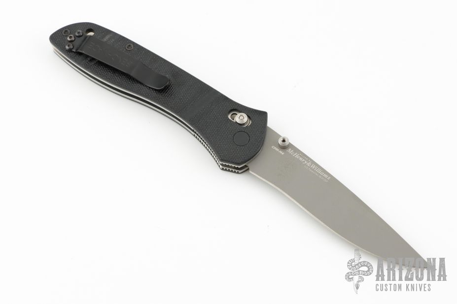 This Benchmade 710 McHenry & Williams has a bead blast finished blade with dual thumb studs. Handle is black G10 scales with milled ribs, stainless steel liners, and black stainless steel tip up clip. Comes with the wrong Benchmade box(552-400), and papers. Has some scratches on the clip. Excellent condition.
