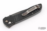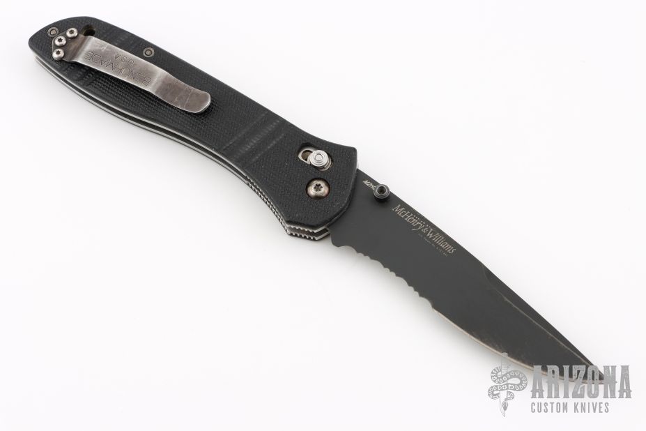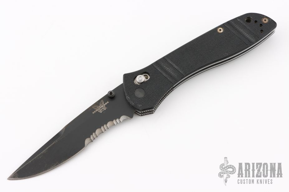 This 710HSSR Axis lock folder by Benchmade has a black spear point blade with partial serrations.  The handle is black G-10 over steel liners, black fiber back spacer, lanyard hole. Tip up reversible pocket clip. Includes the original box, and papers. Has scuffs and scratches throughout. Fair condition; good user condition otherwise.