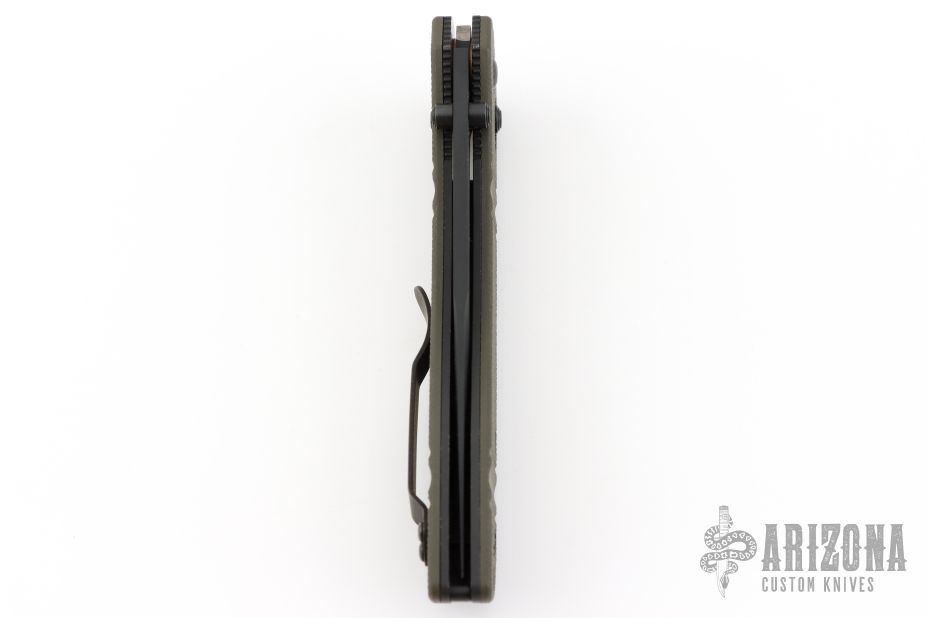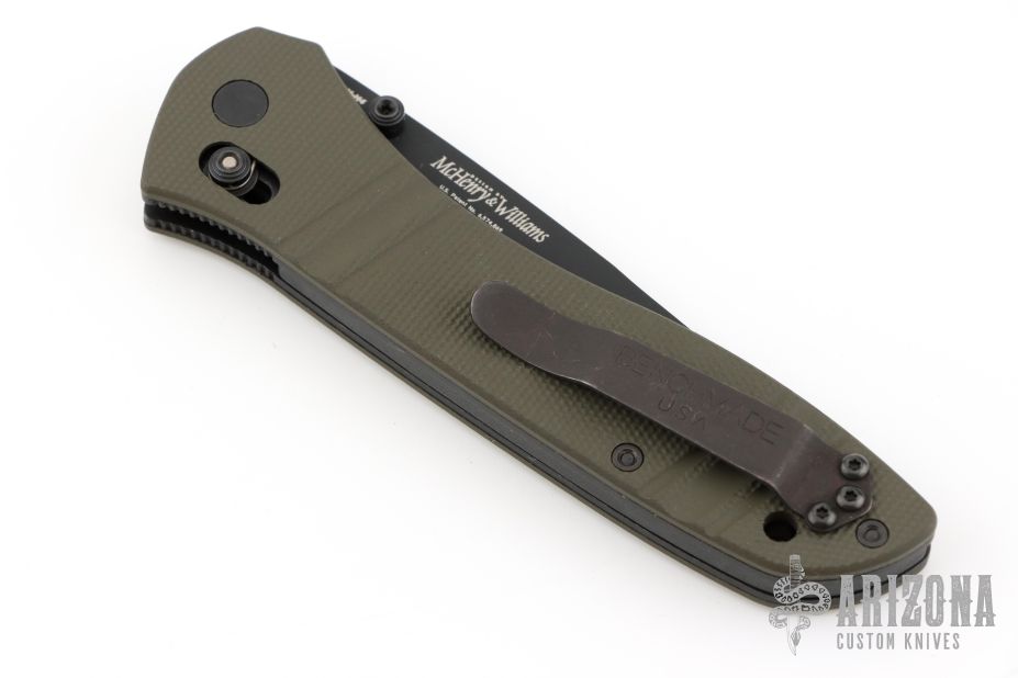 This Benchmade 710-801 features a black finished drop point blade with "53 of 300" on the blade. The handle is OD Green milled G10 with the axis locking mechanism and reversible deep carry clip positioned for tip up carry. Nice action, detent and blade seating. Comes with original box and pouch. Has some light scratches on the clip, Excellent condition.