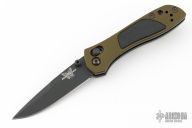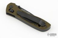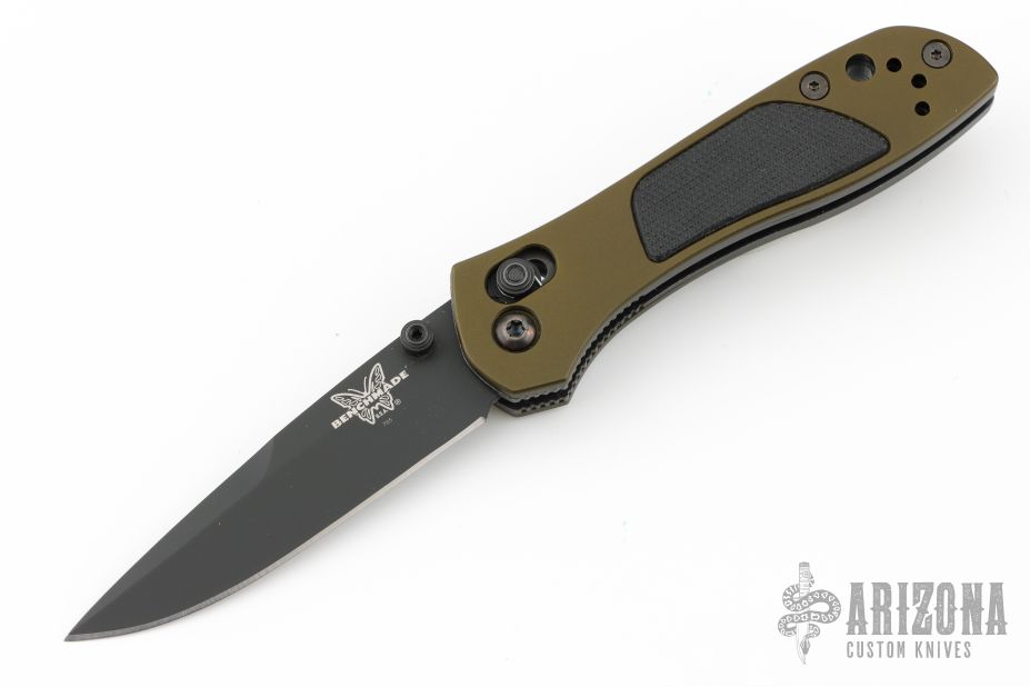 This 705 from Benchmade features a black finished spear point blade with dual thumbstuds, and a false top edge. The handle has green aluminum covers g10 inserts, stainless steel liners, and a black backspacer. Tip up reversible black clip. Comes with original box. Has some scratches on the clip. Excellent condition.