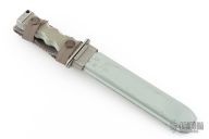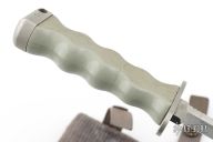 This Dive Knife is very rare. It features a non-magnetic blade with sharpened top edge and saw teeth, .198" blade stock and 1.005" blade depth, hidden tang construction. The handle has a grey composite grip with nonmagnetic guard and butt. Comes with original scabbard. Has scuffs and scratches, otherwise good condition. #18/81. Marked 95692 as well. There appears to be a superficial crack on the handle in the finger grooves. Has scuffs and scratches, excellent condition for its age.