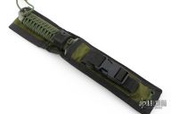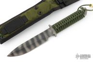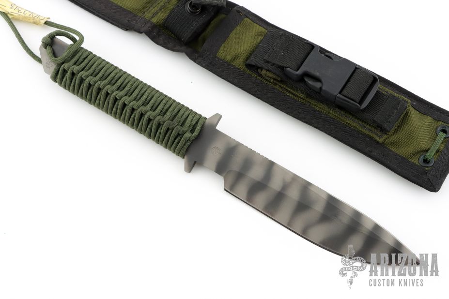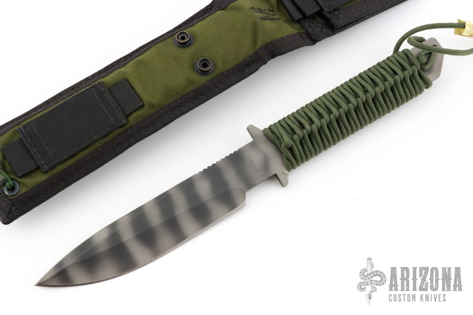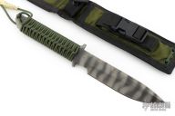 This MT-L by Strider features a tiger striped blade with sharpened top edge and notched thumbrest, .239" blade stock and 1.410" blade depth, full tang construction with paracord wrapped handle. Comes with a nylon sheath. Has some light scuffs and scratches, otherwise Excellent condition.