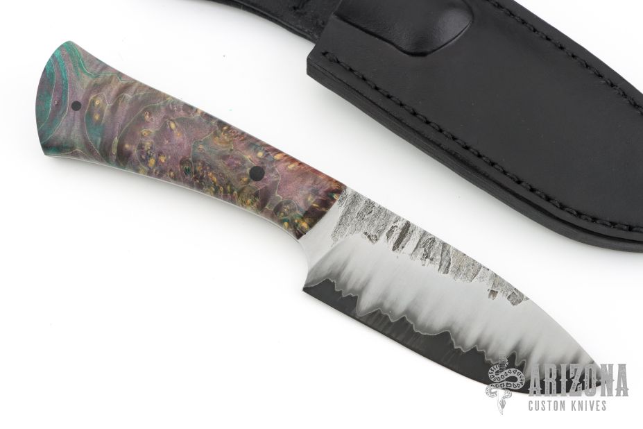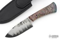 This Knife by Alpha Tango Lima Knife and Tool features a 440 stainless clad with 8670 San Mai blade with a tapered tang construction.  .165" Blade Stock.  1.424" Blade Depth.  The handle has dyed black ash burl scales with micarta pins.  Includes a black leather sheath. New from maker!