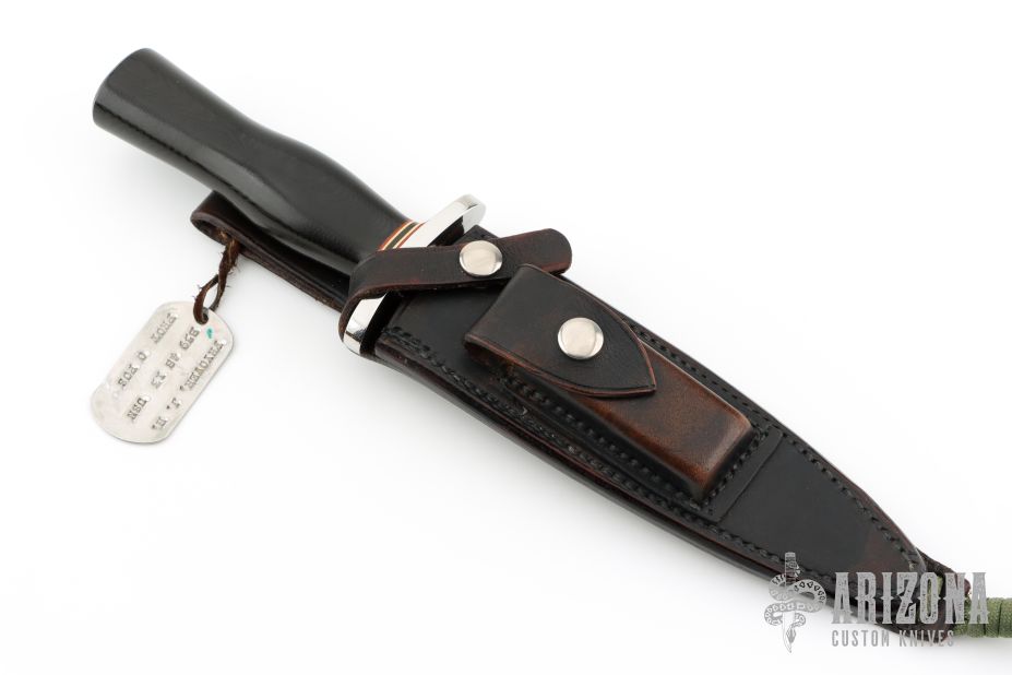 This Model 2-6 Fighting Stiletto from Randall Made Knives has a satin finished double edged blade with .198" blade stock and 1.198" blade depth, hidden tang construction. The handle has a forward curved duralumin guard and black linen micarta grip. Comes with a Johnson roughback brown leather sheath and previous owner's tag. Has some light scratches, excellent condition otherwise.