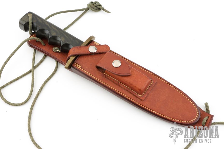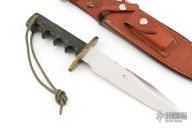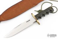 This Model 14 from Randall Made Knives features a satin finished blade with sharpened top edge, .237" blade stock and 1.411" blade depth, full tang construction. The handle is comprised of a brass guard and black linen micarta handle with finger grooves. Has scratches, patina and verdigris. Great condition otherwise.