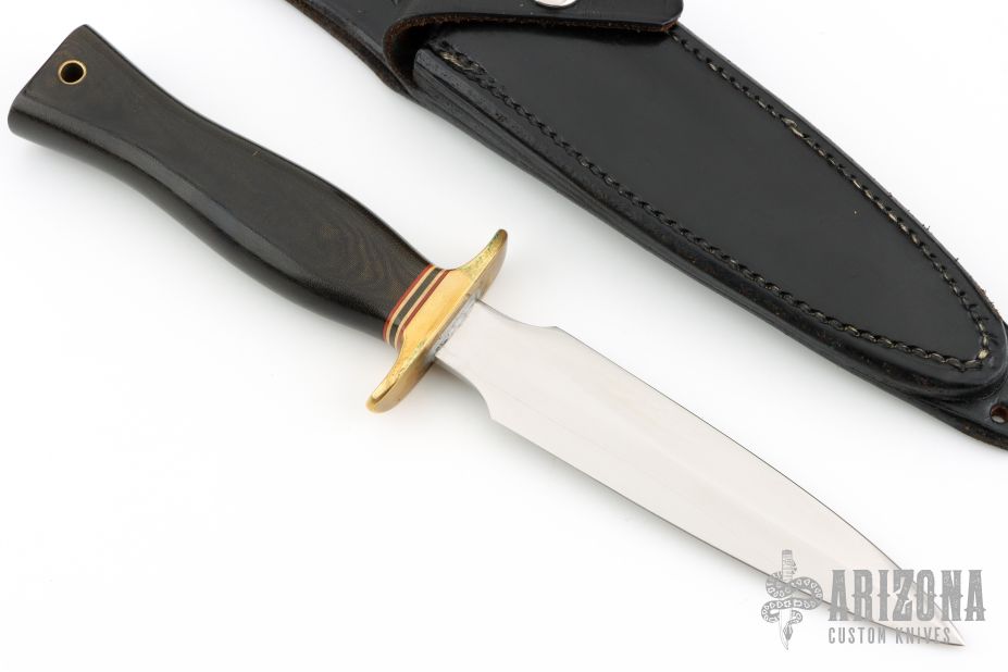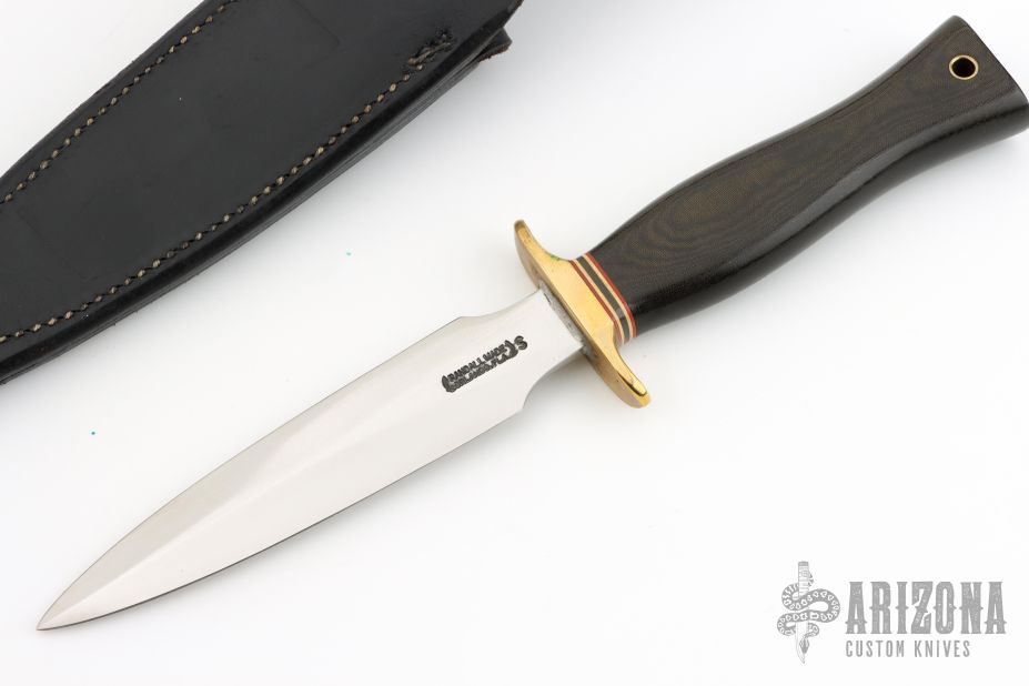 This Model 2-5 Dagger by Randall Made Knives features a double-edged satin finished blade with .168" stock and 1.027" blade depth, hidden tang construction. The handle has a brass guard with red/white/blue spacers and black linen micarta grip with lanyard hole in pommel. Comes with rare black leather sheath. Has some scratches and patina. Excellent condition.
