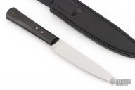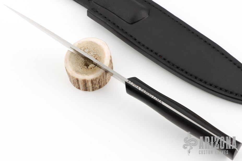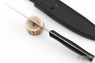 This Lion Killer features a satin-finished blade with a full tang construction. .105" Blade Stock. 1.049" Blade Depth. The handle has African Black wood scales and brass pins. Includes a brown leather sheath. New from maker!