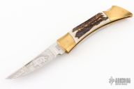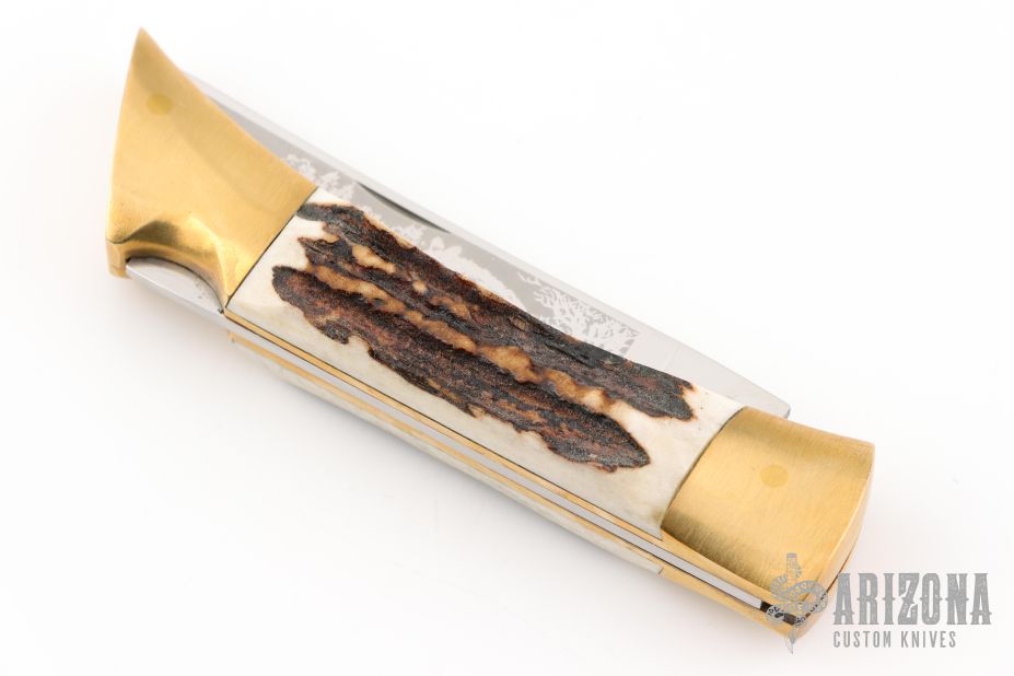 The Wildlife Series was manufactured by Boker. This one has an upswept mirror polished blade with an image of a wild hog. The handle has a brass frame with dovetailed bolsters, stag scales, stainless steel backspacer. Has some light scratches, excellent condition otherwise.