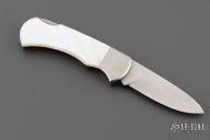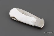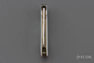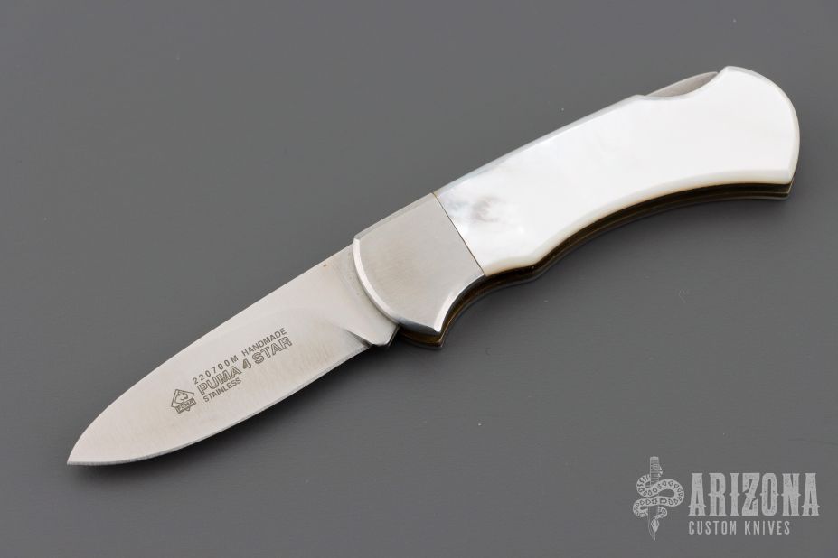 This 220700M 4 Star from Puma Knives features a satin finish drop point blade. The handle has satin stainless bolsters and Mother of Pearl scales over brass liners and stainless steel rockerbar. Has some light scratches, and patina. Excellent condition otherwise.