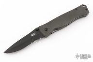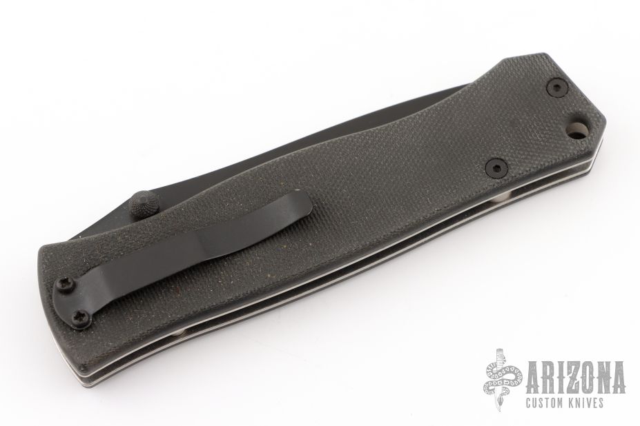 This is a Boker/Brend collaboration is Discontinued. The blade is black with a partially serrated edge. Dual knurled thumbstuds. Textured black G10 scales, stainless liners and black tip down stainless clip. Nice detent, lockup and seating. Very rare and hard to find knife. Has a few light scuffs and scratches, Excellent condition otherwise.