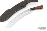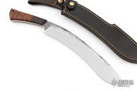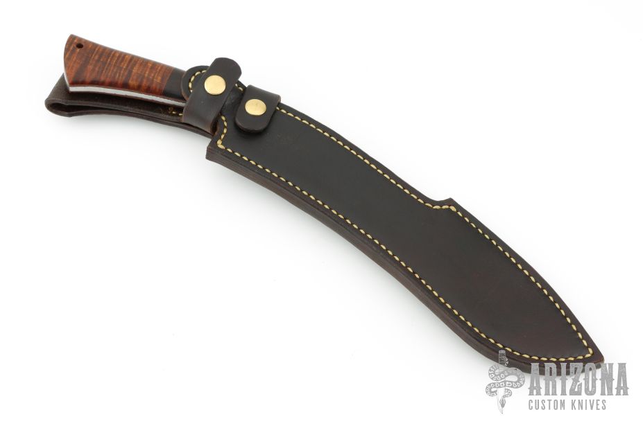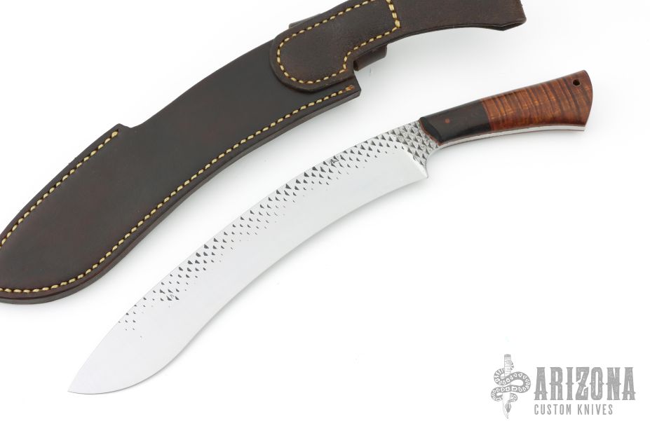 This Kukri by Alpha Tango Lima Knife and Tool features a large recurve blade with a full tang construction.  .137" Blade stock.1.512" Blade Depth.  The blade is from a ferriers rasp.  The handles has curly maple and dessert iron wood scales over micarta liners.  Include a brown leather sheath.  This thing is pretty cool! New from maker!
