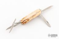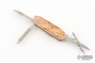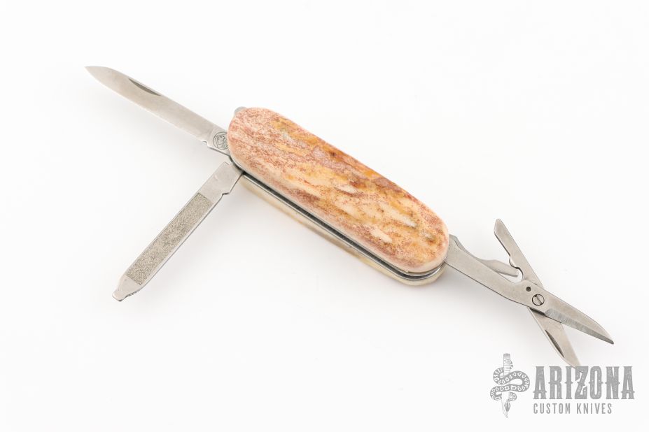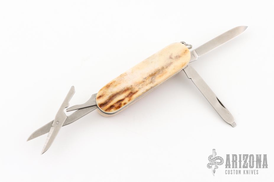 This knife by Puma features satin finished stainless steel (Rostfrei) blades. The handle has stag covers and a keyring.  Has a drop point blade, file, and small scissors. Has some light scratches, excellent condition for its age and otherwise.