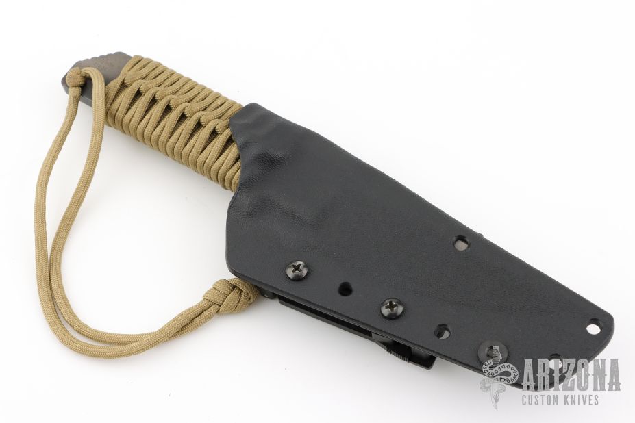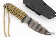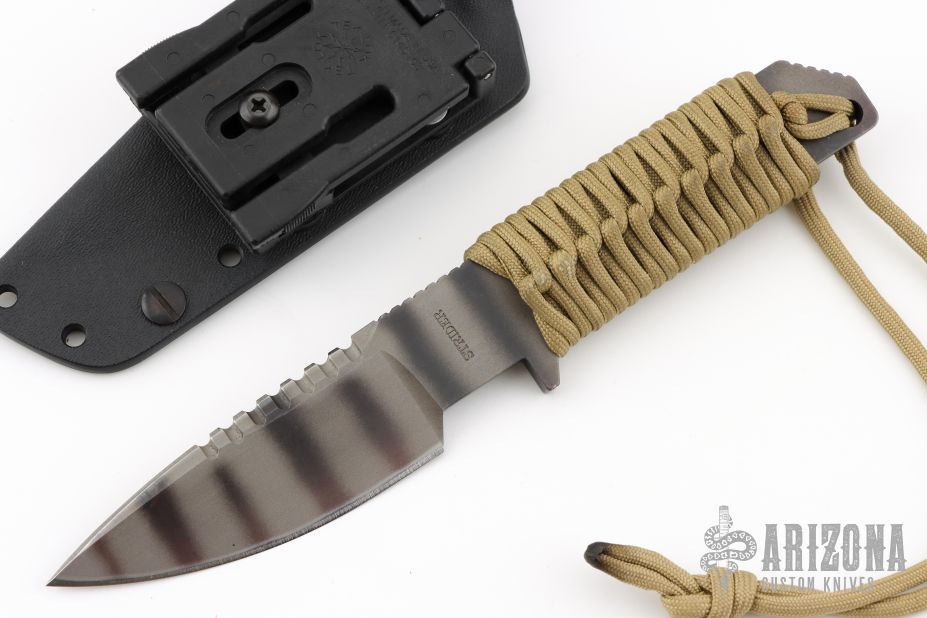 This HT-S by Strider Knives features a tiger striped spear point blade with a notched thumbrest and a full tang construction.  .243" Blade Stock.  1.307" Blade Depth.  The handle features tan cord wrapped handle.  This knife includes a black kydex sheath. Has some scuffs, excellent condition.