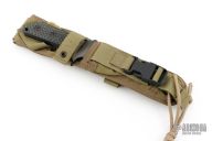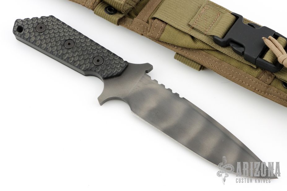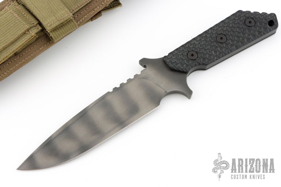 This Mark-1 Mod 10 by Strider has a tiger stripe blade with notches on thumbrest and butt, .249" blade stock and 1.431" blade depth, full tang construction. The handle has gunner grip black G-10 scales. Comes with nylon sheath. Has some light scuffs, otherwise excellent condition.