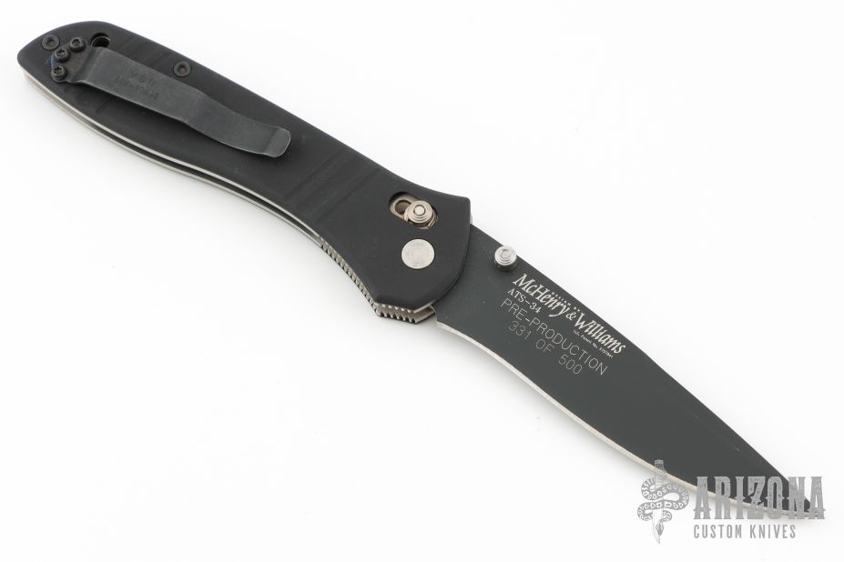 This 710 McHenry & Williams designed folder by Bencmade features an M2HS black blade with swedge and dual thumb studs. The handle is comprised of black aluminum scales over stainless steel liners and black polymer backspacer. Lanyard hole in pommel and black coated stainless steel tip up clip is reversible for right or left hand carry. Comes with original box and papers. Has a few light scuffs, excellent condition otherwise.