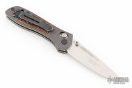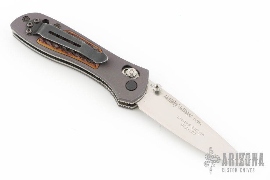 This is a McHenry and Williams designed knife by Benchmade features a tumble finished blade with dual thumbstuds. The handle has bead blasted and anodized aluminum scales with jigged bone inlays, stainless liners, black stainless steel reversible tip up clip. Comes with original box and papers. #040/100. Has some light scuffs and scratches, excellent condition otherwise.