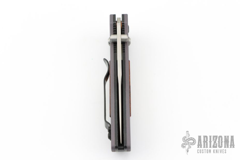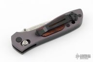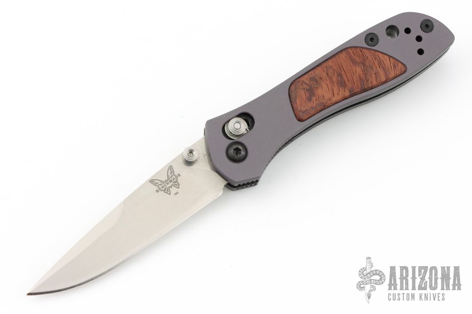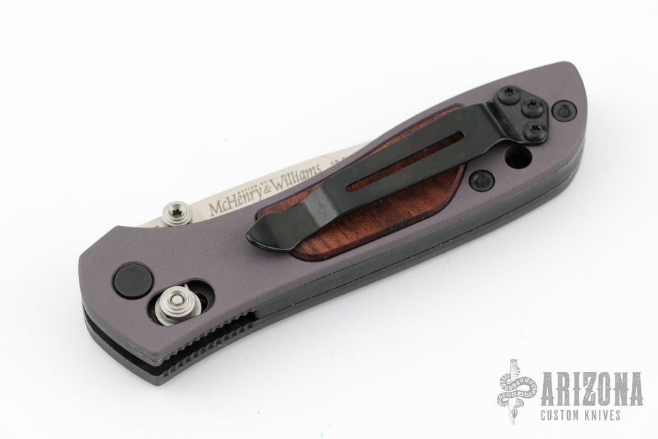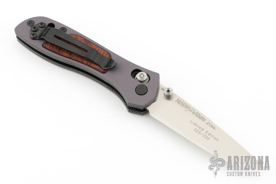 This is a McHenry and Williams designed knife by Benchmade features a tumble finished blade with dual thumbstuds. The handle has bead blasted and anodized aluminum scales with bubinga inlays, stainless liners, black stainless steel reversible tip up clip. Comes with original box. #020/200. Has a couple light scuffs and scratches, otherwise excellent condition.