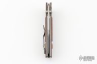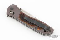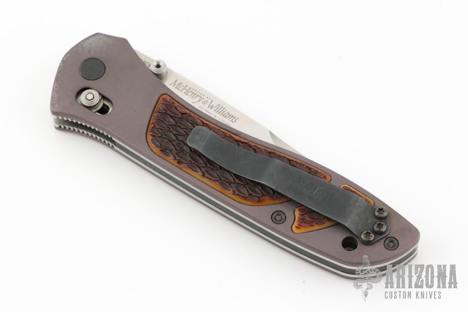 This is a McHenry and Williams designed knife by Benchmade features a tumble finished blade with dual thumbstuds. The handle has bead blasted and anodized aluminum scales with jigged bone inlays, stainless liners, black stainless steel reversible tip up clip. Comes with the wrong Benchmade box (710-1401), pouch, and papers. #052/100. Excellent condition.