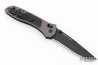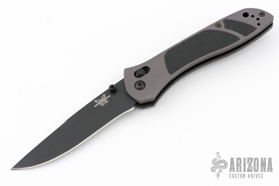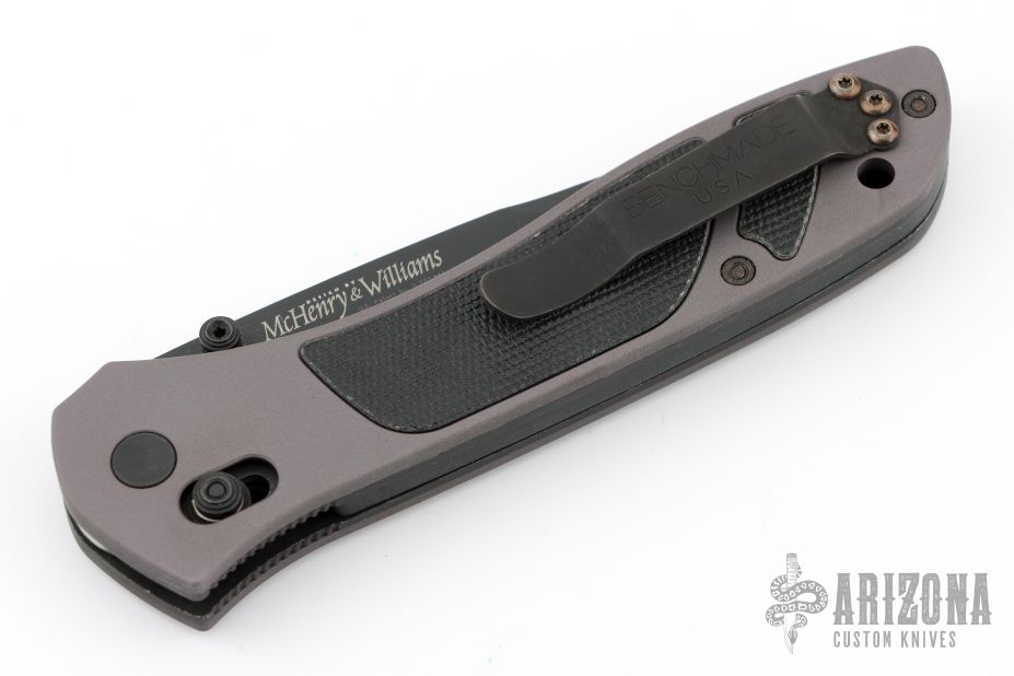 This is a McHenry and Williams designed knife by Benchmade features a black finished blade with dual thumbstuds. The handle has bead blasted and anodized aluminum scales with G10 inlays, stainless liners, black stainless steel reversible tip up clip. Comes with the original clamshell style box, papers, and outer paper sleeve. Has a couple light scuffs, excellent condition otherwise.