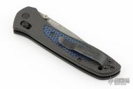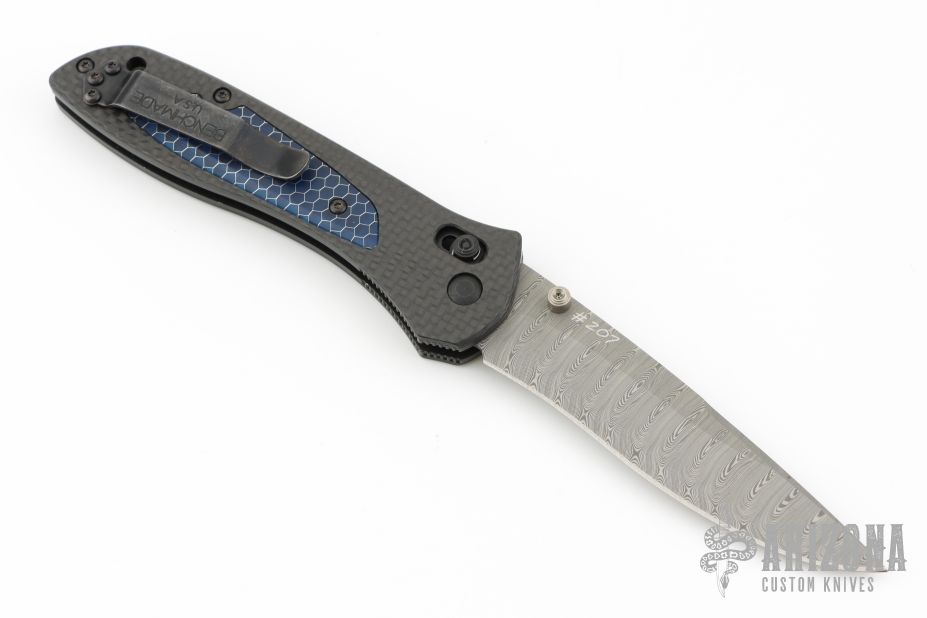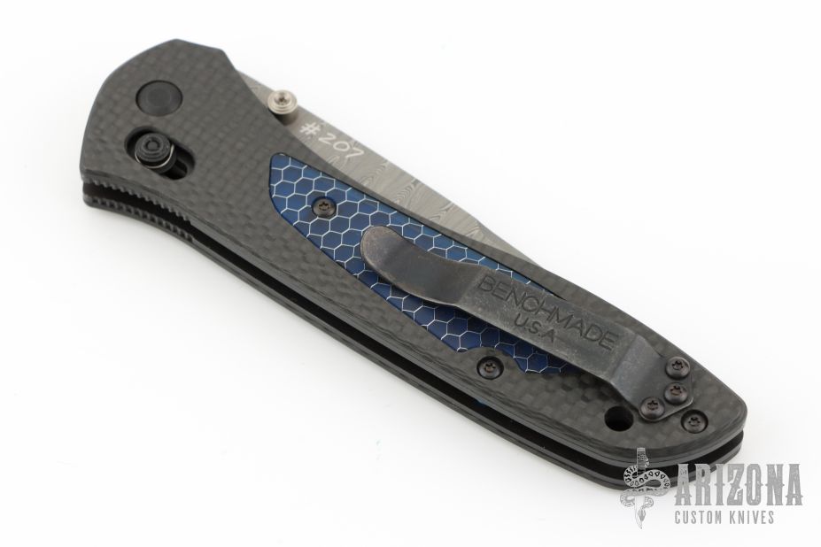 This is a McHenry and Williams designed knife by Benchmade features a Damasteel blade with dual thumbstuds. The handle has carbon fiber covers, CTEK inlays, black finished stainless liners, anodized standoffs, black finished reversible tip up clip. Comes with the original magnetic box, papers, COA, drawstring pouch and Gold Class outer box. Has some scratches on the clip. Excellent condition.