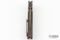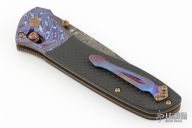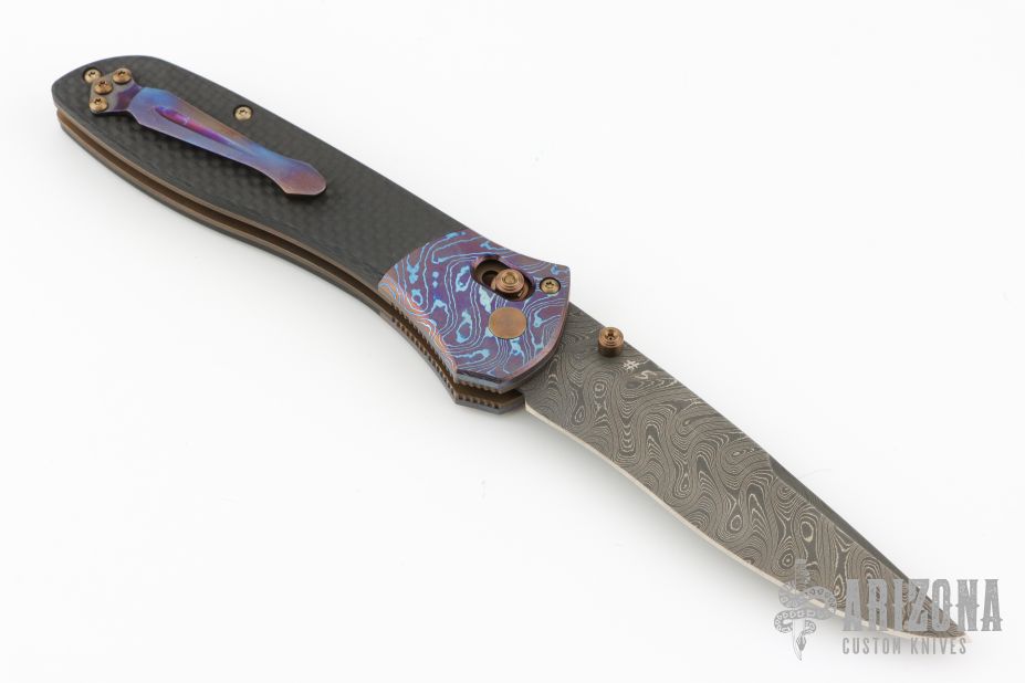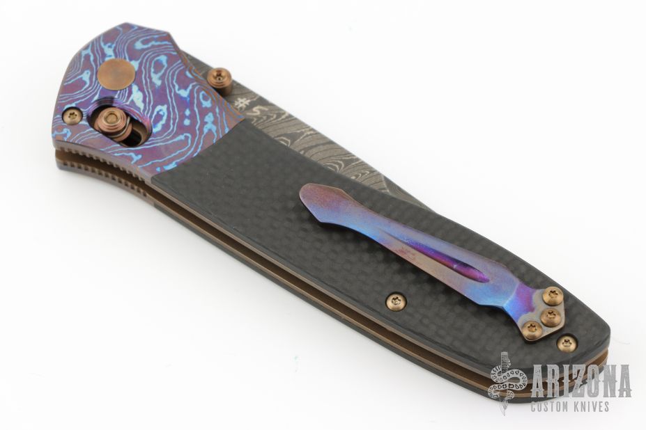 This is a McHenry and Williams designed knife by Benchmade features a Damascus blade with dual thumbstuds. The handle has carbon fiber covers, mokuti bolsters, heat colored stainless liners, anodized standoffs, anodized finished reversible 3D tip up clip. Comes with the original magnetic box, papers, COA, drawstring pouch and Gold Class outer box. Excellent condition.