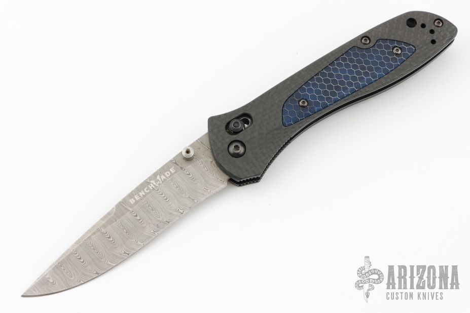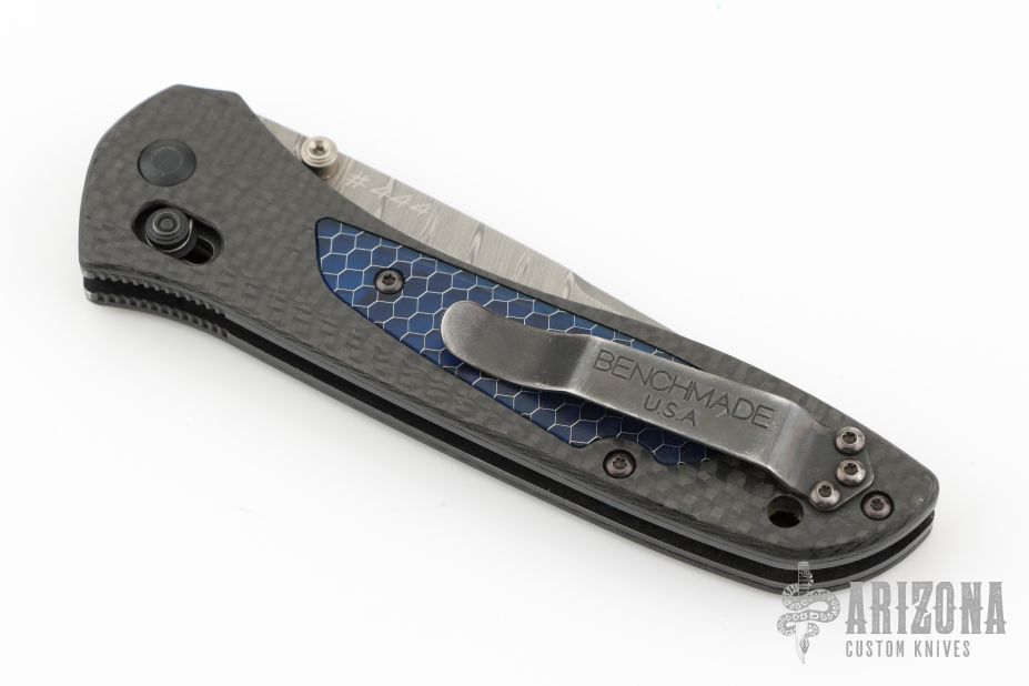 This is a McHenry and Williams designed knife by Benchmade features a Damasteel blade with dual thumbstuds. The handle has carbon fiber covers, CTEK inlays, black finished stainless liners, anodized standoffs, black finished reversible tip up clip. Comes with the original magnetic box, papers, COA, drawstring pouch and Gold Class outer box. Has some scuffs and scratches on the clip. A couple light scuffs on the blade and button. Great condition otherwise.