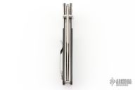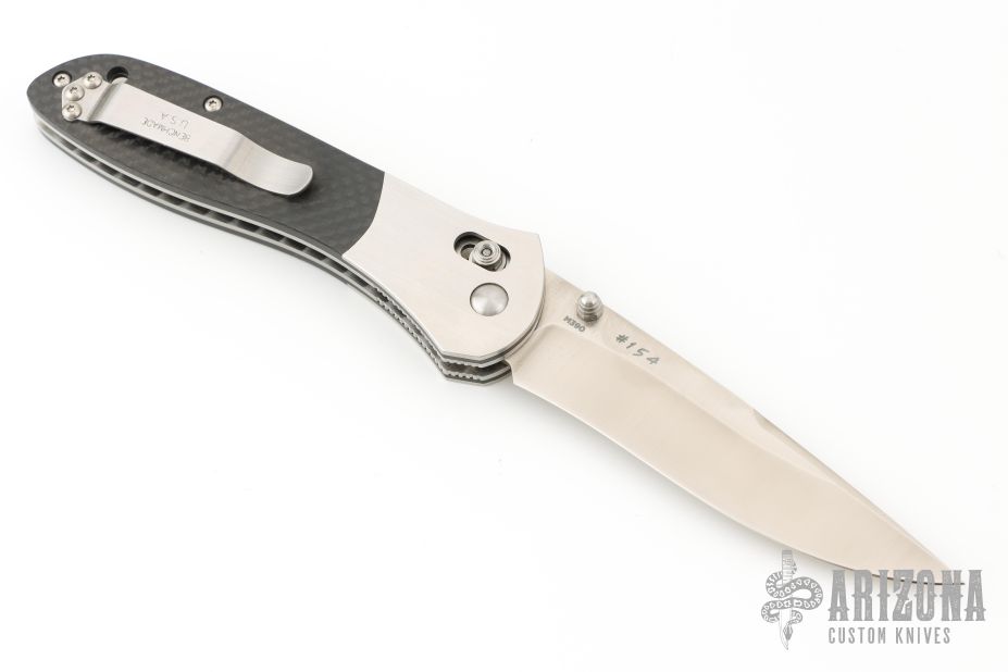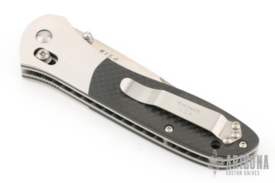 This is a McHenry and Williams designed knife by Benchmade features a satin finish blade with dual thumbstuds. The handle has satin finished titanium bolsters with carbon fiber covers, satin finished stainless liners, satin finished stainless tip up clip. Comes with the original magnetic box, papers, COA, drawstring pouch and Gold Class outer box. Has a couple light scratches, excellent condition.