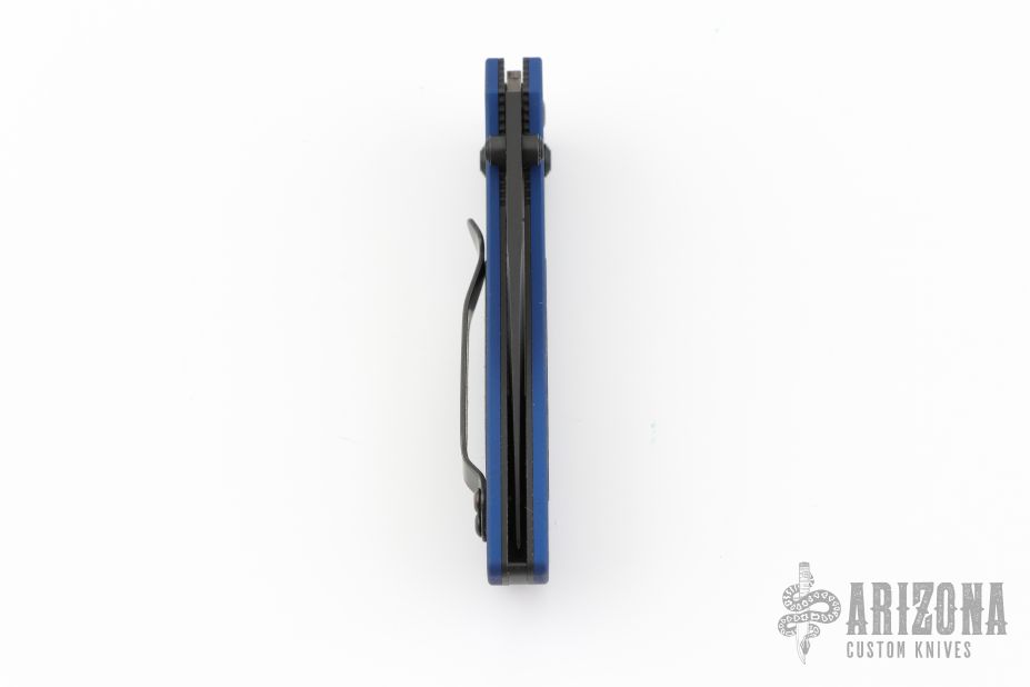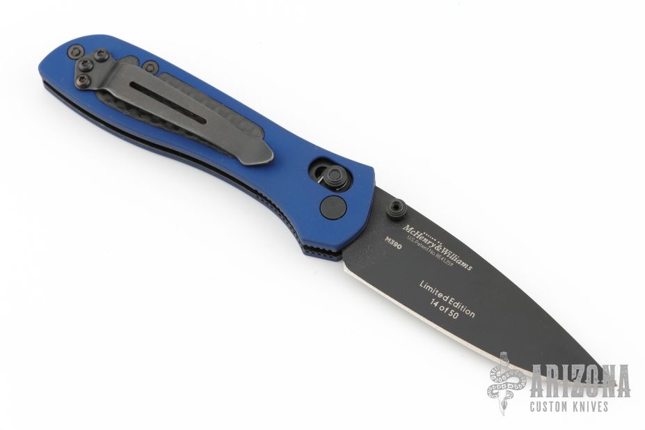 This Sequel by Benchmade features a black finished drop point blade with swedge and dual thumb studs. The handle is comprised of machined and anodized aluminum scales with carbon fiber inlays, over stainless steel liners and black backstrap. Black reversible tip up clip. Includes original box, pouch and papers. Has a couple light scuffs, otherwise Excellent condition.