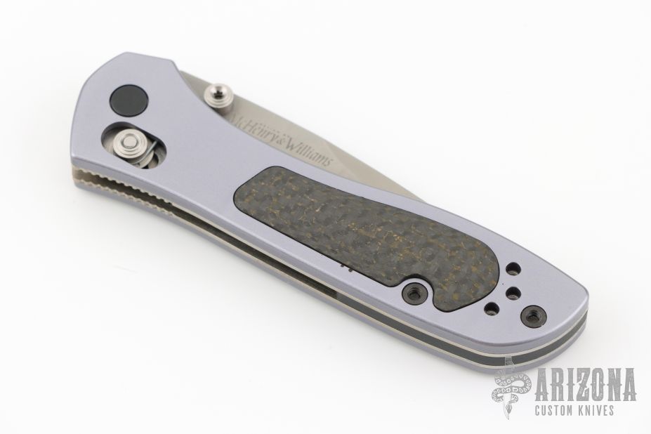 This Sequel by Benchmade features a satin finished drop point blade with swedge, and dual thumb studs. The handle is comprised of machined and anodized aluminum scales with carbon fiber inlays, over stainless steel liners and black backstrap. Includes original box, pouch and papers. NO CLIP. Has a couple light scuffs, otherwise Excellent condition.