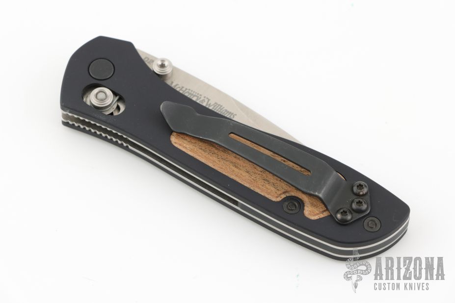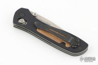 This Sequel by Benchmade features a tumble finished drop point blade with swedge and dual thumb studs. The handle is comprised of black aluminum scales with wood inlays, over stainless steel liners and black backstrap. Black reversible tip up clip. Includes original box, and pouch. Has a couple light scuffs, otherwise Excellent condition.