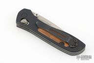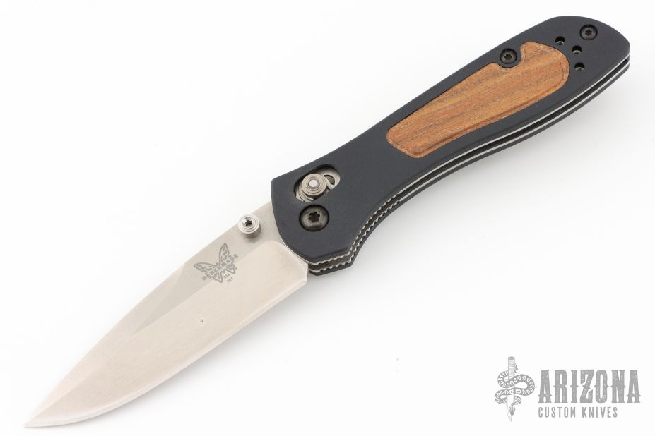 This Sequel by Benchmade features a satin finished drop point blade with swedge and dual thumb studs. The handle is comprised of black aluminum scales with wood inlays, over stainless steel liners and black backstrap. Black reversible tip up clip. Includes original box, and pouch. Has some light scuffs and scratches, otherwise great condition.