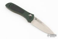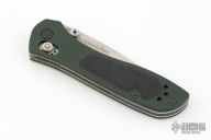 This Benchmade 707 satin finished drop point blade with dual thumb studs. Handle is green aluminum with G10 inlays and holes for a tip up clip. NO CLIP. Comes with the wrong Benchmade box (710D2), papers and drawstring pouch. Has a couple light scuffs and scratches, excellent condition otherwise.