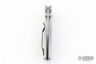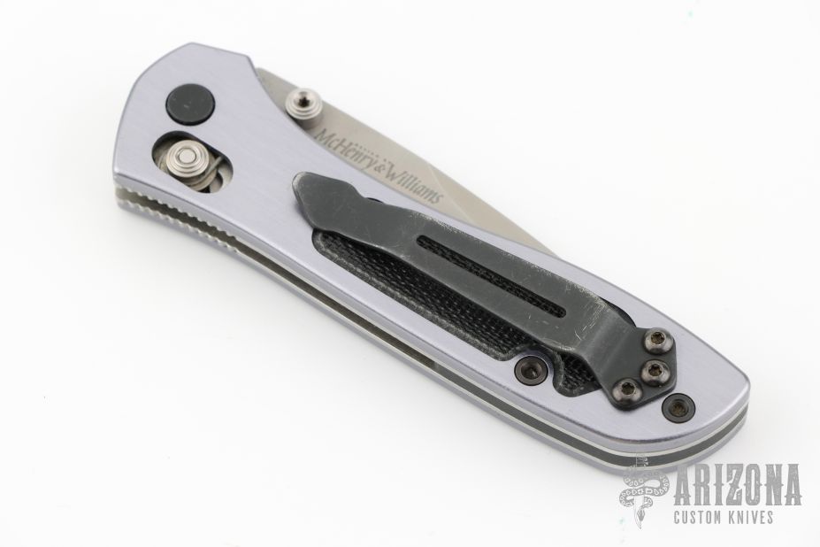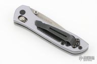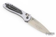 This Sequel by Benchmade features a satin finished drop point blade with swedge, and dual thumb studs. The handle is comprised of machined and anodized aluminum scales with G10 inlays, over stainless steel liners and black backstrap. Black reversible tip up clip. Includes the wrong Benchmade box (705-401), pouch and papers. Has some scratches on the clip and some scuffs on the blade. Otherwise Excellent condition.