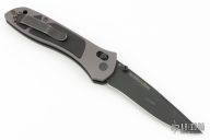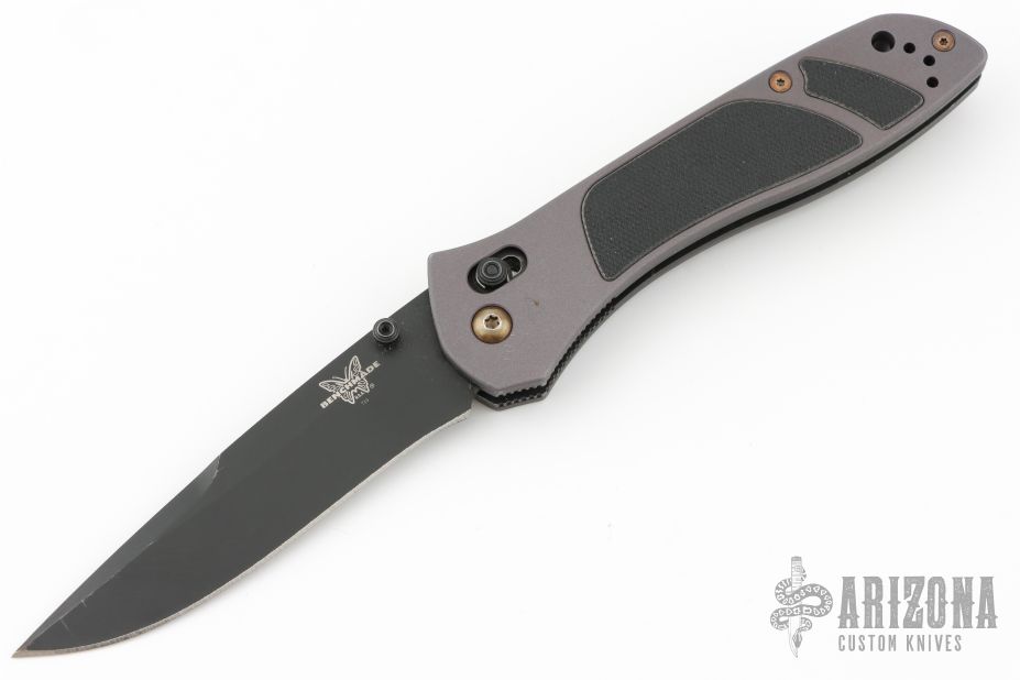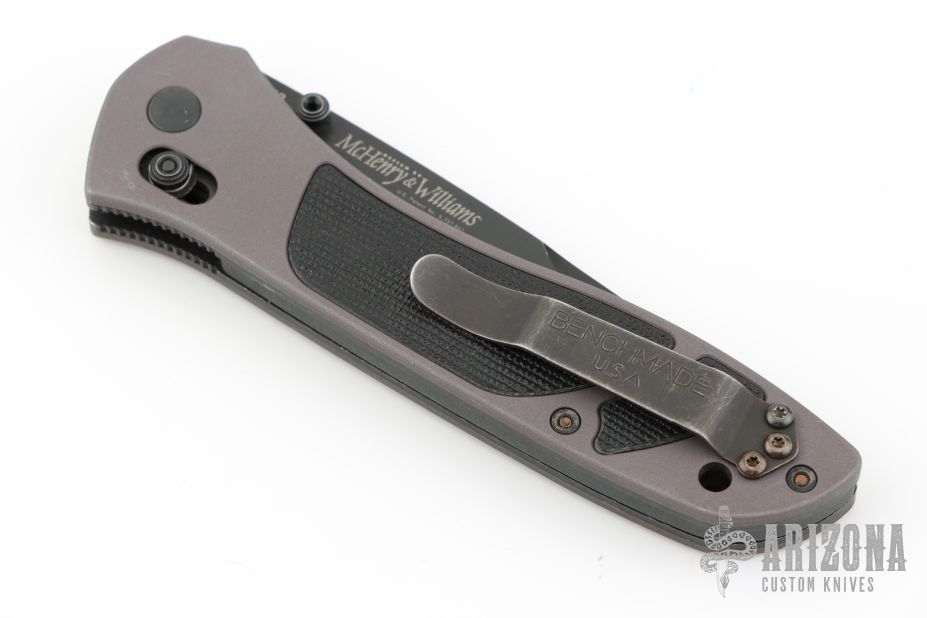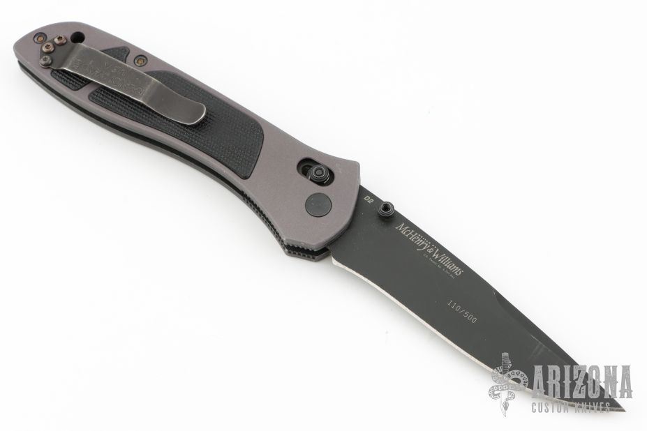 This is a McHenry and Williams designed knife by Benchmade features a black finished blade with dual thumbstuds. The handle has bead blasted and anodized aluminum scales with G10 inlays, stainless liners, black stainless steel reversible tip up clip. Comes in the wrong Benchmade box (556). Has scuffs, scratches, and shows wear. Good condition otherwise.